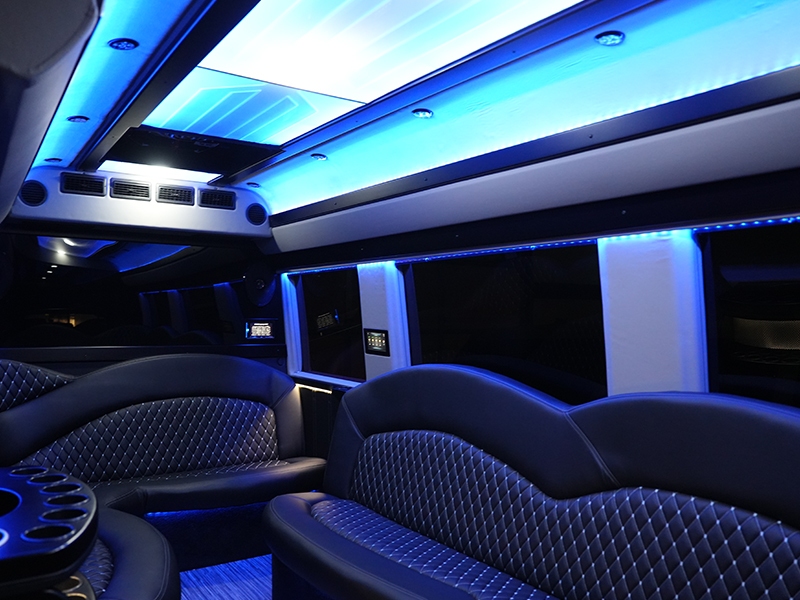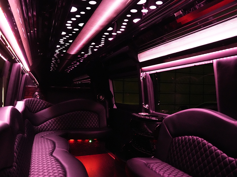 This unit has double the led lighting, and can hold 12-14 passengers in the back, depending on the size of the guests. The seats are black leather with red stitching, and it features stainless steel ceiling and a grey Imitation hard wood floor. Get the party started with a radio that is AM/FM Bluetooth capable with charging ports for your phone. An ice chest, champagne glasses upon request ($10.00 each for missing or broken), and a trash can are also included.