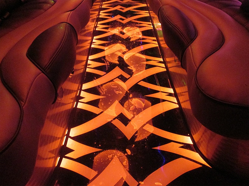 Plush interior boasts wavy gray-and-black seating, plexiglass patterned floors, a tear-drop pattern lit ceiling, 6-color fiber optic accent lighting, and 8-color “wash” lighting. Wash, or color wash, lighting means the floor, ceiling, and/or walls will absorb the chosen color of light.