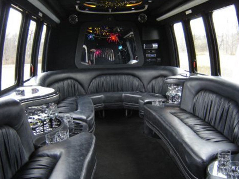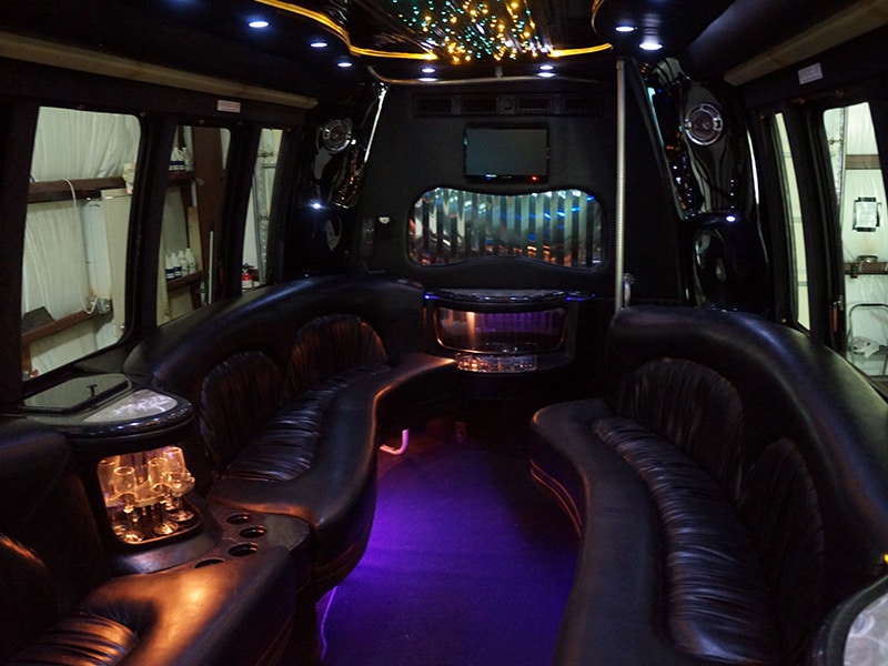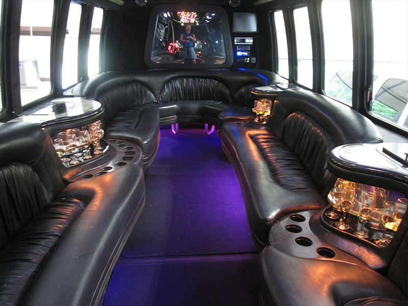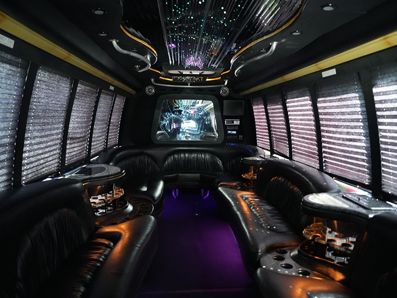 The inside of this bus is all black. Black leather pit perimeter seating and black carpet throughout. Add the color with the fiber optic ceiling and 6-color changing lighting. The large mirror across the back will keep the party going with a simulated firework show displayed throughout your ride.