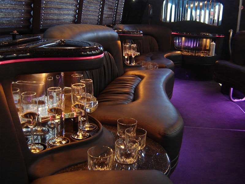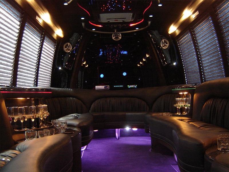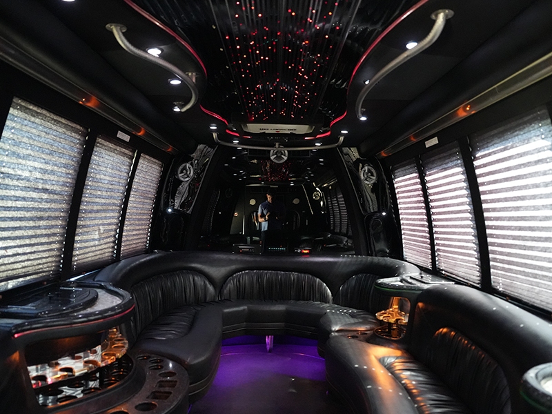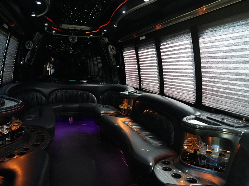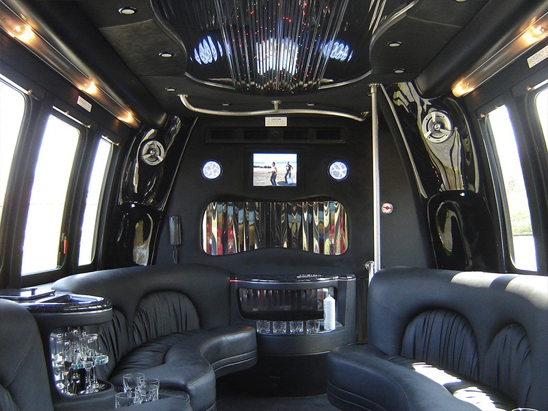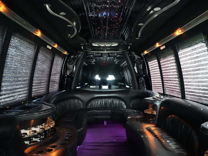 Interior boasts elegance with all black everything. Get comfortable on the black leather pit perimeter seating atop the black carpet flooring. Add some noise with the neon lighting under the seats and 6-color fiber optic lighting on the ceiling and throughout the entire bus. Two large ice bins are built in and have enough room for your own food and beverages.